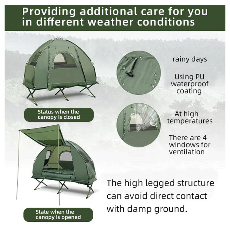 210D Oxford အထည်နှင့် Pu3000mm ရေစိုခံသည့်အဖုံးဖြင့်တည်ဆောက်ခြင်းဖြင့်ဤတဲသည်မိုးသည်းထန်စွာရွာသွန်းခြင်းနှင့်မြေကြီးအစိုဓာတ်ကိုအပြည့်အဝကာကွယ်ပေးသည်။